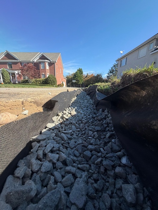 We installed a 58-linear-foot French drain system designed to intercept and redirect concentrated surface and subsurface water flow.